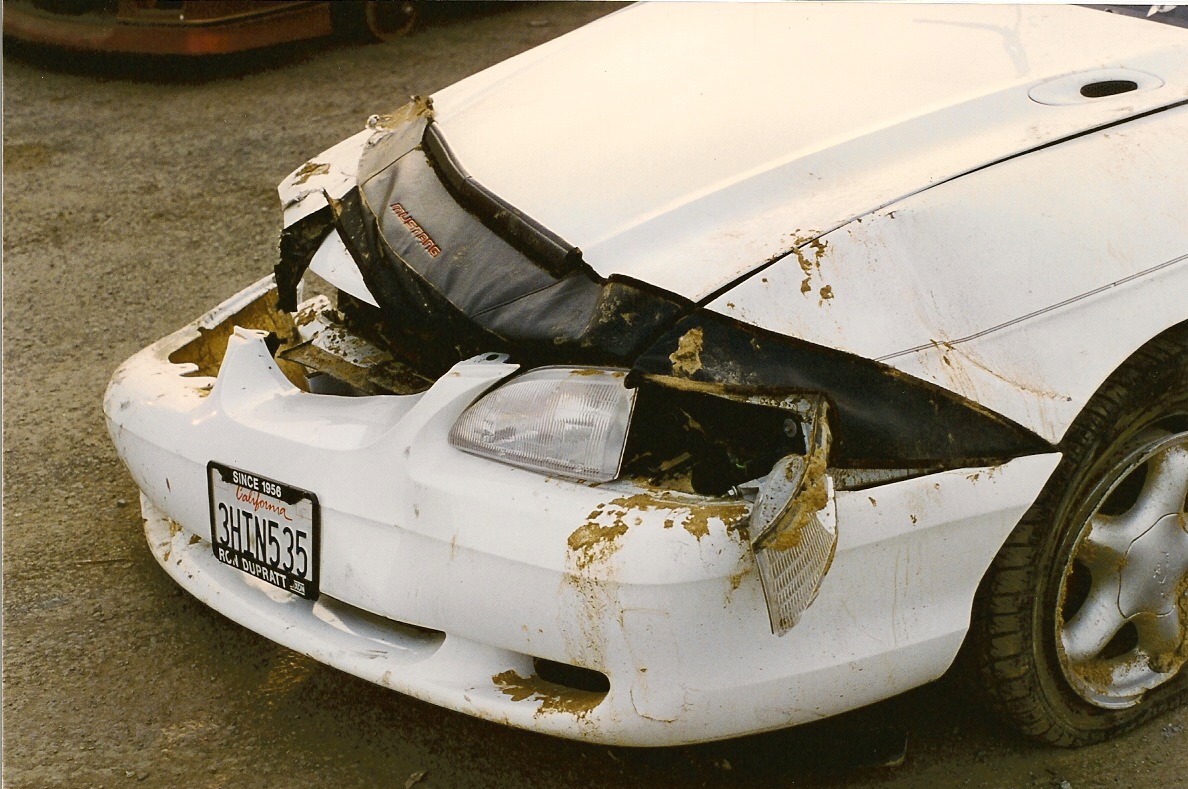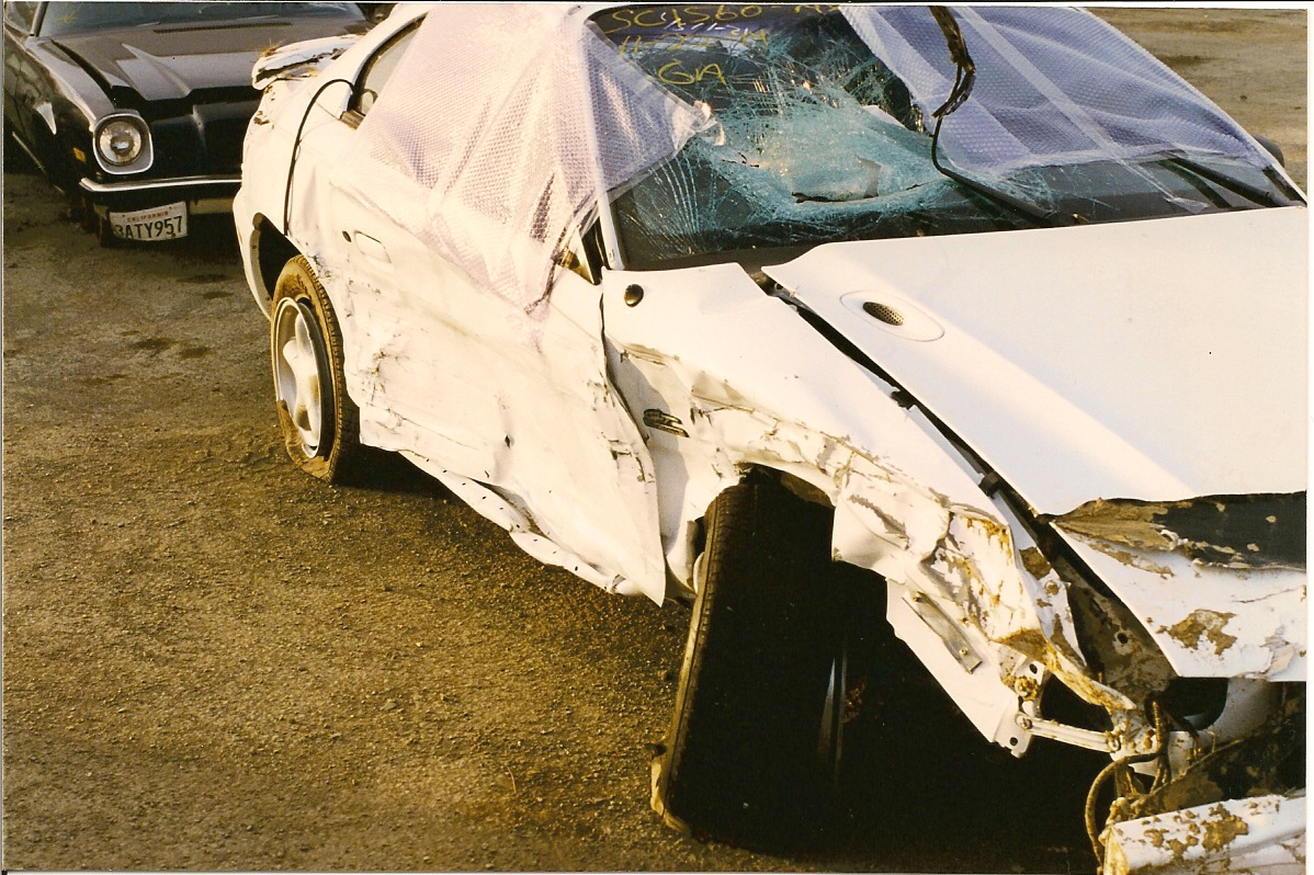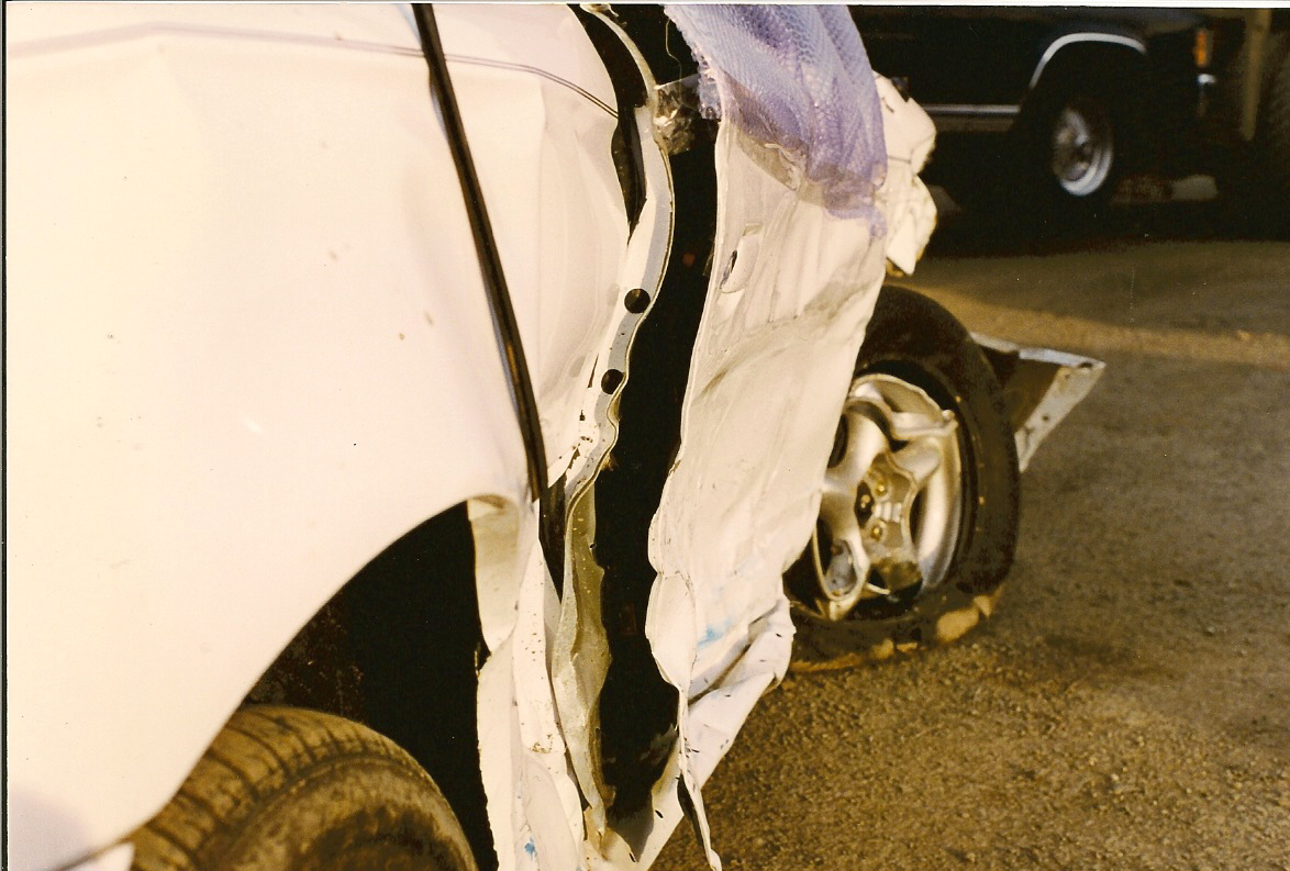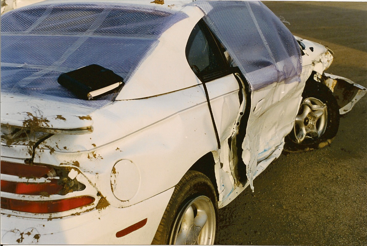 This is what happens when you are 17 and driving too fast in the rain. Unfortunately, I happened to be there too. Not much to do but try to get out of the way which I did not manage to do successfully. Good thing no one was in my passenger seat at the time. They might not have been as lucky as I was. This is what a brand new car looks like after a head-on collision followed by three roll overs on a muddy hill through 60 feet of barbed wire fence. Funny thing is, I never knew how soft the headliner was until I crawled around on it on my knees trying to GET OUT!!!! Fortunately, there was a gaping hole where the passenger door glass used to be. Seatbelts and air bags saved my life....