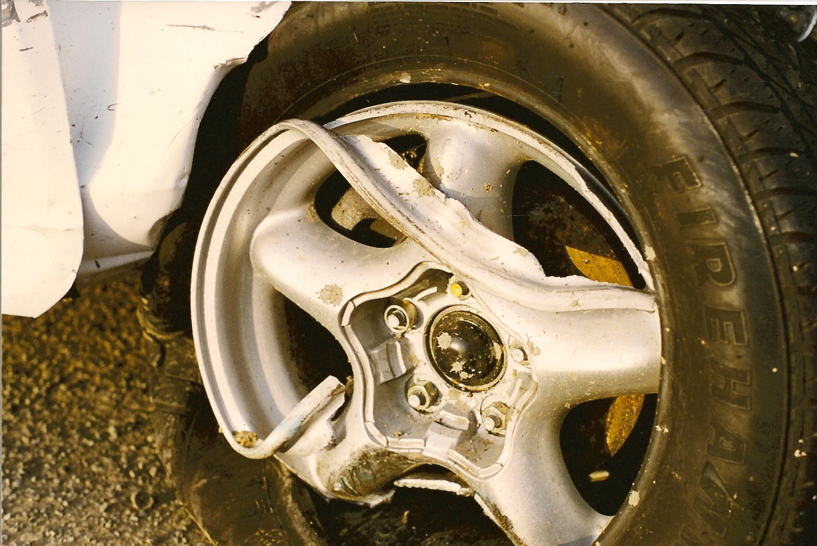 * Dented Left front quarter * Nothing left of Right Front Quarter Panel * Right front wheel moved back 15" * Dented roof * Aluminum lip peeled on right side wheels * 4 flat tires * Deployed air bags * Mud crusted seats * Bent Frame * Owner irritated but still breathing * Left headlight still worked though