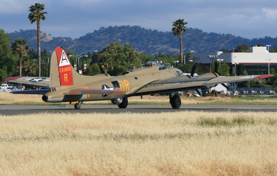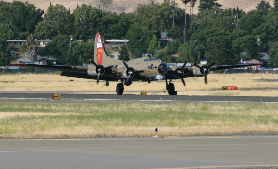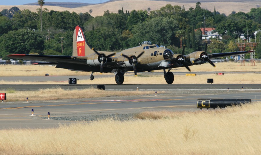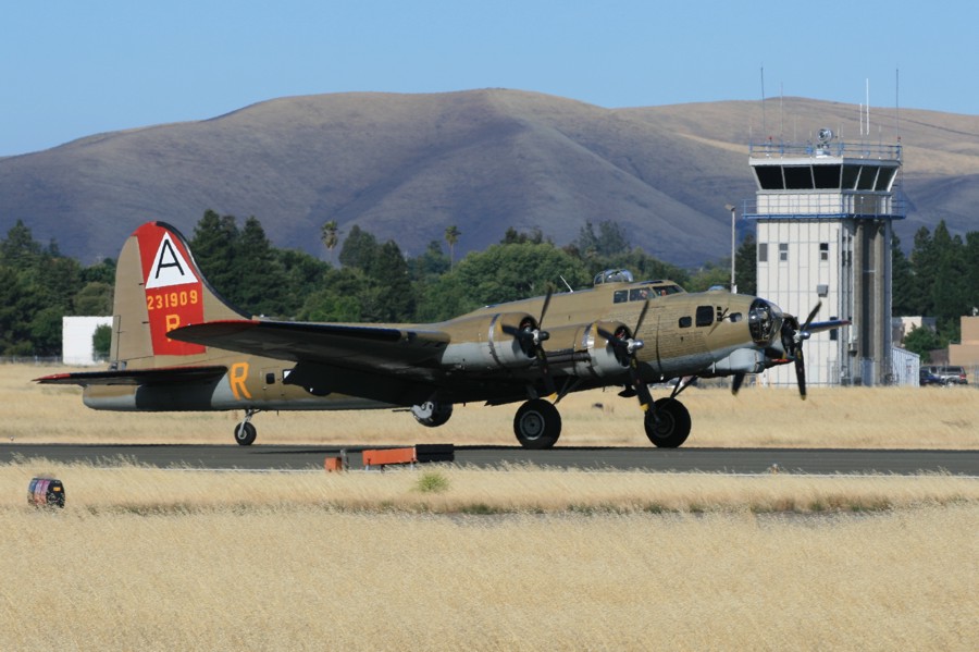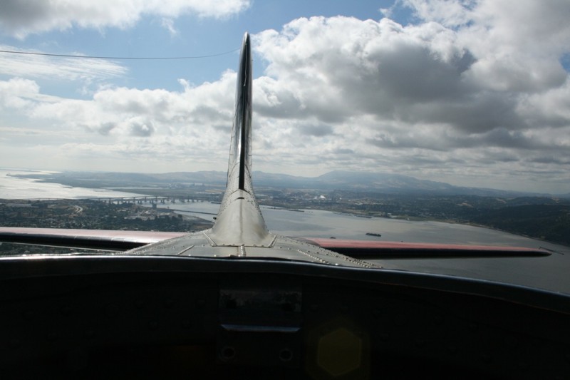 Kelly seeing us off in Pleasant Hill from our back yard Carquinez Straight from 2500 feet looking out the radio operators egg!!! In the Bombardiers Compartment - Ready to drop our eggs!!! Landing at Buchanan Field last June Main wheels down Rolling past the tower Heading towards the hardstand with Shell Ridge in the background